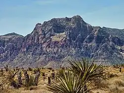 Las Vegas is situated in a basin on the floor of the Mojave Desert,[33] and is surrounded by mountain ranges. Much of the landscape is rocky and arid, with desert vegetation and wildlife. It can be subjected to torrential flash floods, although much has been done to mitigate the effects of flash floods through improved drainage systems.[34]