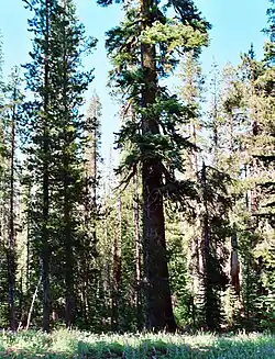 Surveys estimate the forest contains 92,000 acres (37,000 hectares) of old growth. Sierra Nevada mixed conifer forests (Coast Douglas-fir (Pseudotsuga menziesii var. menziesii), Ponderosa Pine (Pinus ponderosa), and White Fir (Abies concolor)), Jeffrey Pine (Pinus jeffreyi) forests, Red Fir (Abies magnifica) forests, and Lodgepole Pine (Pinus contorta) forests are the most common types.[4] It is a major source of lumber products.