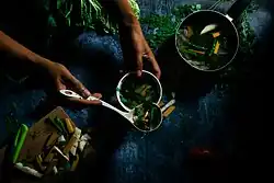 The primary ingredient of the dish are leafy vegetables like moringa leaves, mustard greens, pepper leaves, and pechay, among others. It is cooked with a variety of vegetables with onion, tomato, garlic, and ginger in a broth seasoned with seafood stock or patis. Lemongrass and siling haba can also be added to the broth. The vegetables normally used in sinabawang gulay include okra, calabaza, eggplant, yardlong beans, bitter melon, calabash, chayote, green papaya, and taro tubers, among many others. Regional variations of the dish may also contain dried fish, shrimp, mussels or clams.[5][6]