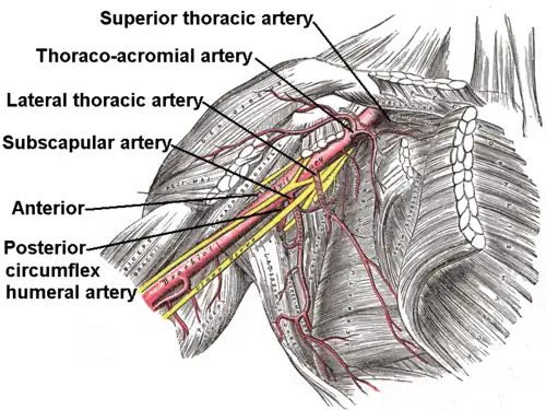 Axillary artery, with its branches, including the lateral thoracic artery. Anterior view of right upper limb and thorax. | |