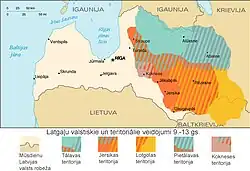 The Latgalians were an Eastern Baltic tribe whose origin is little known. In the 5th and 6th centuries, they lived in the eastern part of present-day Vidzeme (west of the Aiviekste River), and later on in nearly all the territory of that region.[1] In written sources, they are mentioned from the 11th century onward. In the first two decades of the 13th century, the (Western) Latgalians allied with German (mainly Saxon) crusaders. Their lands (the Eldership of Tālava, the Principality of Jersika and the Principality of Koknese) were incorporated into Livonia as vassal states.
