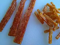 Latiao (simplified Chinese: 辣条; traditional Chinese: 辣條; lit. 'Spicy stick/spicy strip') is a popular Chinese snack. Latiao consists of strips made with wheat flour (especially wheat gluten), flavored with chili pepper. It is chewy, spicy,[1] and tangy.[2]