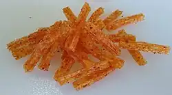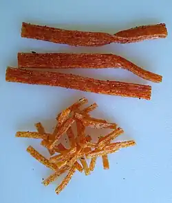 Latiao is commercially produced by extrusion from a mixture of gluten-rich dough.[3] Beyond chili pepper, salt, sugar, and other spices are commonly used.[1] Commercial preparations may contain flavor enhancers, pigments, and preservatives.[3] Specific additives used in latiao have been the subject of scrutiny in China.[2][3]