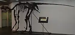 During the 1980s, a team from UNAM's Geological Institute, including Shelton P. Applegate, René Hernández-Rivera, Espinosa-Arrubarrena, the SEPC team, and some volunteers, excavated the remains of a dinosaur near the town of Presa de San Antonio, belonging to the Cerro del Pueblo Formation in the Parras Basin, located in Coahuila, Mexico. The specimen was found by Don Ramón López, which was a juvenile specimen of 6 meters long, 2.2 height at the waist, and an estimated weight of 3 tons, of which 65% was recovered.[2] This was the first dinosaur skeleton from Mexico to be mounted for public display.[3] This specimen, though fairly complete, lacked a skull, but was identified as the saurolophine Kritosaurus sp. based on comparisons with Kritosaurus incurvimanus, which is now considered a more recent synonym of Gryposaurus notabilis.[4] Due to its importance, the skeleton was given the informal name of "Isauria", and it is exhibited in the Museum of the Institute of Geology of the UNAM, Universum, Museo Papalote in the State of Hidalgo, Museo del Desierto, and several private parks. Serrano-Brañas, in 2006, identified one of the bones collected as a supposed nasal, and together with the appendicular skeleton, he referred to the genus Gryposaurus in his thesis.[5][6]