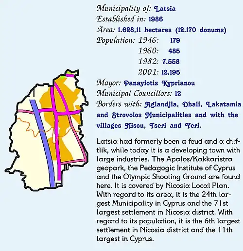 Latsia (Greek: Λατσιά [locally [laˈt͡ʃʰa]]) is a municipality on the south east outskirts of Nicosia, Cyprus, is today one of the city's largest suburbs. It hosts the new Nicosia General Hospital, the new GSP Stadium and the Mall of Cyprus. Latsia has seen a great increase of population right after the Turkish invasion of the island and it became the home of many refugees since refuge housing was developed there. The population in 2011 has reached 16,774 people. Since 2024, after Local government reform, Latsia has been included in the newly created Latsia-Geri Municipality.