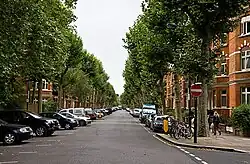 The street was built in 1875 and was named after a prominent Paddington resident the Earl of Lauderdale, an admiral in the Royal Navy.[1] Built some time after the streets to the south of it were laid out, it was not until the late nineteenth century and the Edwardian era that the area was completed. It features large red brick mansion blocks with apartments, in contrast to the area further south which featured the white stucco terracing of the early-to-mid Victorian era.[2] Typical of the style of the street, and surrounding area, is Lauderdale Mansions South. In 1896 the Lauderdale Road Synagogue was built in the street to serve the significant Jewish population in the area.[3] It was constructed in the Neo-Byzantine style and is now Grade II listed.[4][5]
