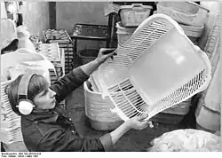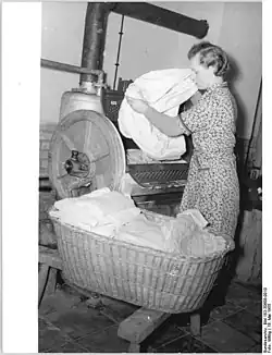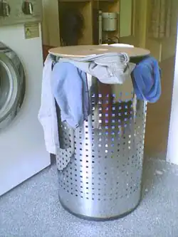 A laundry basket is a basket used for storing clean or dirty clothes, for storage before washing and drying, or for transporting clothes.[1] They are used to keep clean and dirty laundry collected and organised, and can prevent clothes from getting lost or mixed up. Laundry baskets are often placed in a bathroom or laundry room as a piece of furniture in a home, while laundry bags are sometimes used to keep dirty laundry separate during travel.