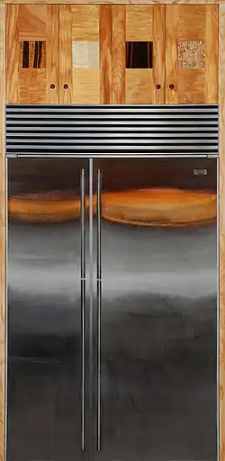 - Refrigerator Portrait Series (2001) - In this series Kina comments on class, family, and identity, by creating trompe-l'oeil depictions of household refrigerators. The refrigerators are titled after their masters, all members of Kina's extended family. The paintings convey something about their owners' identities through magnets, drawings, rings, and other protrusions appearing on their doors. This series deals with the ever-blurring boundaries between race, religion, and national identity. One of the paintings, titled "The Rosenfelds," depicts a high end Sub-Zero refrigerator made of shining steel and surrounded by custom wood cabinetry and foliage. Unlike the other works in this series, this refrigerator's surface is unadorned. In its stark simplicity, its formal presence invokes the work of Mark Rothko and Barnett Newman.[6][7] "While the variety of adornments on the Kina-Aronson fridge indicates a multiplicity of identities, the interiors of the refrigerators, and, by extension, the inner lives of their owners, remain closed to the viewer".[8]