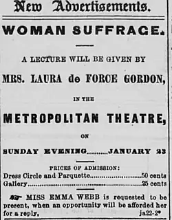 Gordon also traveled outside of the Southwest, representing California at the 1872 National Woman Suffrage Association in New York City.[16] At the 1872 Liberal Republican convention, alongside Susan B. Anthony, she asked the party to seat her as a representative from California (to "laughter") and submitted a pro-suffrage resolution.[17][18][19]
