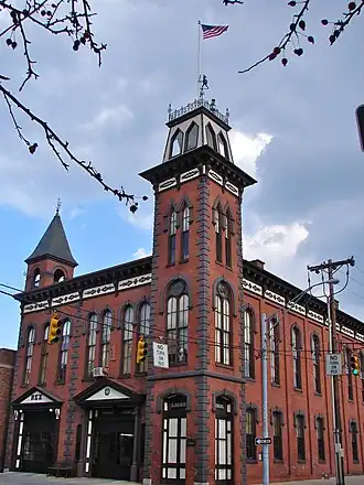 The Laurel–Rex Fire Company House, consisting of the Laurel Fire Company's engine house and the Rex Hook & Ladder Company's truck house, is a historic fire station located in York City, York County, Pennsylvania. The oldest building, the Laurel engine house, was built in 1878, and is a two-story, brick building in the Italianate style. The original engine house was expanded in 1887 with a horse stable and in 1892 with a ladder truck house. It has a three-story bell tower on the southwest corner and a second faux tower atop the roof on the northwest corner. It measures 48 by 96 feet (15 by 29 m).[2][3]