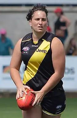 She then joined VFLW club Eastern Devils. In 2012 she suffered an ACL tear while training with the Devils, but continued to play on the damaged knee for the rest of the year without surgery, instead resting the injury for three months before returning and then another six months before having surgery to fully repair the injury.[5] In 2016 she averaged a goal per game for the club.[1]