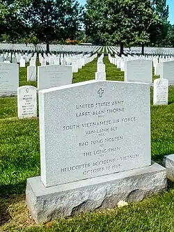Formally identified in 2003, his remains were buried on 26 June 2003 at Arlington National Cemetery, along with the RVNAF casualties of the mission recovered at the crash site.[29][30] He was memorialized on the Vietnam Veterans Memorial at Panel 02E, Line 126.[31] He was survived only by his fiancée, Marja Kops.[32]