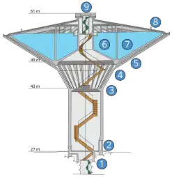 Kotkavuori is located 27 metres above sea level. The height of the water tower was 34 metres, so its roof was located 61 metres above sea level. The diameter of the water container was 42 metres at the widest point. On top of the shaft of the tower were 24 support beams at a 60-degree angle, with a 15.8 metre wide support ring on top of them. The purpose of the beams and ring was to support the water container and to ensure that the structure did not suffer damage due to changes in outdoor temperature or the shape of the concrete shell.[3]: 8