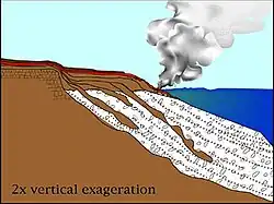Collapse of the frontal part of lava deltas is common during their formation, representing a hazard for any people that are watching from a solidified part of the delta and such areas are normally marked as dangerous.[8] If a newly formed lava bench rests on sediments, it may pose hazards due to its extremely unstable structure.[6] Oftentimes, these benches are so unstable that they collapse into the sea, exposing the water to the hot lava on the interior of the bench and releasing acres of land into the ocean.[6] When the hot lava hits the water, violent explosions of steam can shoot large rocks and molten lava up to 300 feet (90 m) inland.[5] These collapses are extremely dangerous because they can happen without warning, and anyone or anything on the bench will be caught in the collapse. For safety, people are advised not to walk on lava benches because of their unstable nature, and they must maintain a safe distance from the lava bench.[9]