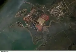 Industry is heavy along the bay, with an abundance of natural gas and oil wells at all corners. Natural gas was discovered at the site in 1934, and oil was discovered the next year. Point Comfort is home to several industrial plants along the shore, including Alcoa, Union Carbide, DuPont, and Formosa Plastics Corp. Despite the restrictions on the bay that prevent the production of fish and shellfish along the superfund site, seafood harvesting is a major industry. However, it is not as prominent as it was in the 1920s, when Port Lavaca led the nation in shrimp production, leading to the construction of a quick-freezing plant.[5] Today, shrimping is only allowed south of the Port Lavaca Causeway, due to the north's classification as a nursery location.[19] Shellfish production is allowed in Keller Bay and Lavaca Bay south of Point Comfort, but is restricted along the eastern and northern coast and Chocolate Bay, and is conditionally approved in the remaining locations, including along the shore of Port Lavaca.[20] A small tourism industry also fuels economic growth, spurred by the Port Lavaca State Fishing Pier found alongside the Port Lavaca Causeway. The pier once served as the causeway across the bay but was replaced in the 1960s and converted into a fishing pier of 3,200 feet (980 m),[21] billed as the longest in the world. However this pier is now memorialized by its remains, posts, and small platforms no longer accessible from the shore stand alongside the modern causeway.[10]