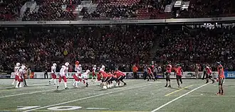 In the following season, Laval lost a Vanier Cup game for the first time in program history, as they fell 41-38 to the McMaster Marauders in double overtime in the 2011 Vanier Cup.[16][17] This game was played at BC Place and was the first Vanier Cup to be played in Vancouver.[16] The Rouge et Or would exact a measure of revenge the following year in a rematch against the Marauders in the 48th Vanier Cup.[18] The team won a Canadian collegiate record seventh Vanier Cup championship in front of an also record crowd of 37,098 fans at the Rogers Centre in Toronto by a score of 37–14.[18] In 2013, they won back-to-back national championships for the second time in program history when they defeated the Calgary Dinos in the 49th Vanier Cup by a score of 25–14.[19] The game was again played at Telus Stadium on the campus of Laval University in front of 18,543 fans.[19]