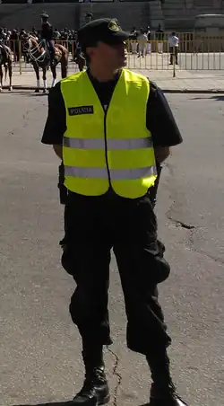 The daily work uniform consists of dark blue cloth combat pants with a dark blue shirt or a long-sleeved button-down shirt, black boots, a plain baseball cap with the national police logo and the bulletproof vest on top. Officers may also wear a reflective vest or winter jacket that says "police" on the back.[14]