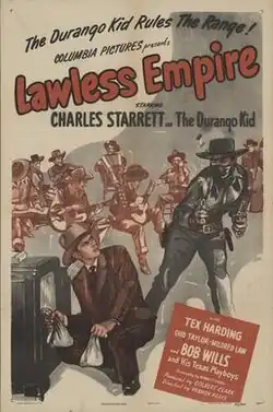 Lawless Empire is a 1945 American Western film directed by Vernon Keays and written by Bennett Cohen. The film stars Charles Starrett, Tex Harding, Dub Taylor, Mildred Law and Bob Wills. The film was released on November 15, 1945, by Columbia Pictures.[1][2][3] This was the seventh of 65 films in the Durango Kid series.[4]
