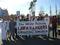 Founded in 1980 by two men from Arcola, Illinois and LaGrange, Illinois, the Lawn Rangers are not the first of their kind. The men, Pat Monahan and John O'Halloran, decided that they wanted to be in their hometown parades, the annual Broom Corn Festival parade and the LaGrange Pet Parade, so they started to think about what skills they possessed. After deciding that they didn't have any, their wives told them that the only common skill they had was for mowing the lawn. Since Pat Monahan was part owner of the Thomas Monahan Broom Company, they decided to push lawn mowers and toss brooms in the parade. They still needed a name for what they were doing. Clayton Moore, the original Lone Ranger, was the Grand Marshal of that year's Broom Corn Parade, so they became the World Famous "Lawn Rangers." Over the years the Lawn Rangers have lived life by their motto: You're only young once, but you can always be immature.