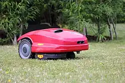 A robotic lawn mower is an autonomous robot used to cut lawn grass. A typical robotic lawn mower (in particular earlier generation models) requires the user to set up a border wire around the lawn that defines the area to be mowed. The robot uses this wire to locate the boundary of the area to be trimmed and in some cases to locate a recharging dock. Robotic mowers are capable of maintaining up to 100,000 m2 (25 acres) of grass.