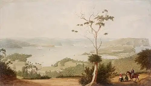 The colonial government offered a reward of ten pounds for the apprehension of either of the two convicts by "any free person"; for the apprehension of either absconder "by a prisoner of the crown" the reward offered was "the allowance of a conditional pardon. The published description of Lawrence Kavenagh was: height, 5 feet 7½ inches; complexion, "ruddy fresh"; brown hair, blue eyes and a "flat nose"; missing his "right little finger", "small scar on back of left hand, and on centre of forehead".[12] Kavanagh and Brown established a base on the North Shore of the harbour where they concealed the articles they had "obtained by plunder".[14] The bushrangers, during their brief period of “committing depredations in the neighbourhood of Sydney” moved freely from one side of the harbour to the other.[12]