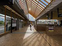 Upon entrance from the Lawrence Avenue bridge over Allen Road, the bus waiting area and the train platform are apparent. This openness is achieved through glazed walls and a large stairwell.[11] The glass is framed with distinctive orange-painted metal. The platform level features exposed concrete walls, with a long strip of skylights above the tracks with the same orange framing used throughout the station. Rectangular prism benches with rectangular tiles of yellow, orange, and brown hues are unique to the station. Similar tiles are used on the floors and centre pillars.