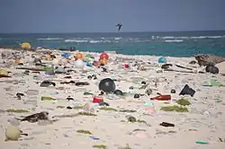 Garbage from passing ships often washes ashore on Laysan. That poses a danger to birds because they can swallow plastic waste, which remains undigested and crowds their stomachs, leaving no room for their normal food. According to observations in her 2006 mission log, Patricia Greene, a NOAA Teacher-at-Sea, found that most of the plastic was of Japanese origin.[12] Additionally, in the 1990s, biologists found that a container of poisonous carbofuran had floated ashore and burst open above the high tide line, creating a "dead zone" in which any living thing was killed.[13]