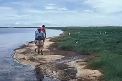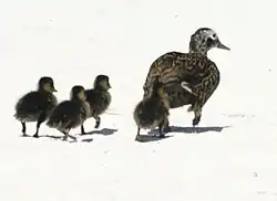 Laysan is generally regarded as the "gem" of the NWHI, with the most biodiversity. It is home to the Laysan duck, the rarest duck in the world.[19] The other native land bird of Laysan is the Laysan finch, an opportunistic hunter. Eighteen other bird species nest there and use Lake Laysan, the only lake in the NWHI, as a rest stop or breeding ground. Laysan also has its share of native plants, many of which, such as Eragrostis variabilis, were extirpated from Laysan during its "extinction period" and then reintroduced from other leeward islands by scientists.[20] Like most other of the NWHI, Laysan is home to Hawaiian monk seals and green sea turtles.