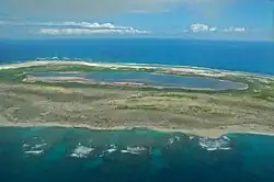 Laysan is the second largest single landmass in the Northwestern Hawaiian Islands, after Sand Island at Midway Atoll. Laysan was created by coral growth and geologic upshift.[2] The fringing reefs surrounding the island cover about 735 acres (297 ha). The tallest point on the island is 50 feet (15 m) above sea level, on a large dune that covers much of the northern portion of the island.