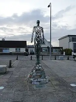 Many of Laytown's larger buildings, including the train station master's house and the large terrace homes facing onto the beach, were built in the mid-nineteenth century.[8] The architecture of the Church of the Sacred Heart is of particular note, with its facade retained from the original nineteenth century, but the main building being to a 1970s circular-plan. It is a single room with a large window overlooking the Irish Sea. On the hill behind the window is a twenty-foot wooden cross.[9]
