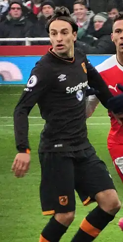 In January 2017, Marković was recalled from his loan in Portugal and joined Premier League club Hull City for the remainder of the season.[40] He made his first Hull appearance as a 59th-minute substitute for Jarrod Bowen in a 2–1 win over Manchester United in the 2016–17 EFL Cup semi-final second leg, as the Tigers lost 3–2 on aggregate.[41] He scored his first goal for Hull by equalising in a 4–2 win at the KCOM Stadium against Middlesbrough on 5 April.[42]
