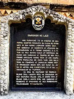 Lazi (formerly Tigbawan) became an independent parish from Siquijor on August 8, 1857. The present stone church was built in 1884 by Filipino artisans followed by the bell tower in the following year.[1] The construction of the convent was made with coral stones and hardwood, commenced in 1887 and completed in 1891. Both the church and the convent were done under the direction of Recollect priest Father Toribio Sánchez.[2]