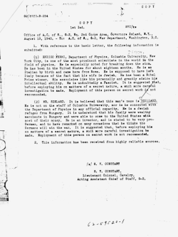 An Advisory Committee on Uranium was formed under Lyman J. Briggs, a scientist and the director of the National Bureau of Standards. Its first meeting on October 21, 1939, was attended by Szilard, Teller, and Wigner, who persuaded the Army and Navy to provide $6,000 for Szilard to purchase supplies for experiments—in particular, more graphite.[60] A 1940 Army intelligence report on Fermi and Szilard, prepared when the United States had not yet entered World War II, expressed reservations about both. While it contained some errors of fact about Szilard, it correctly noted his dire prediction that Germany would win the war.[61]
