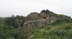 Today the podium-shaped tower base with rock-cut cisterns, the rock-cut yard containing the stables, as well as the moat can still be seen.[6][1] The remains are cut into the living rock,[6] an aeolian quartz sandstone known in the region as kurkar.