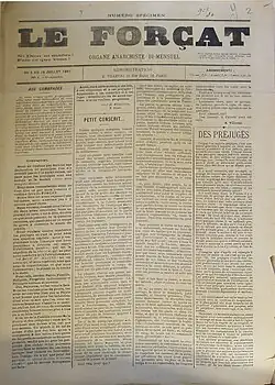 Constance Bantman, a historian specializing in the anarchist movement between 1880 and 1930,[3] cites Le Forçat as an example of anarchist publications from that period that featured highly controversial titles,[4] in this case, the name refers to imprisonment and prisoners sent to the French penal colonies or 'bagnes'.[5][6]