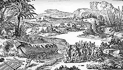La Salle's men first had to build their lodging and then guard against the Iroquois who were hostile to this invasion of their ancient homeland.[2] La Salle had instructed Hennepin and La Motte to go 75 miles (120 km) into wilderness in knee-deep snow on an embassy to the great village of the Seneca tribe, bringing gifts and promises in order to obtain their good will to build "the big canoe" but many tribal members did not approve.[1][2] Beginning on Christmas Day, 1678, La Motte and Hennepin together with four of their men, went by snowshoe to a prominent Seneca chief who resided at Tagarondies[notes 2] a village about 75 miles (120 km) east of Niagara[notes 3] and about 20 miles (32 km) south of Lake Ontario.[8] They wished to secure a reliable truce lest the natives interfere with their projects. Negotiations with the Senecas were only moderately successful, so when they left the village they still wondered if the natives would permit them to finish their project. They reached Niagara again on 14 January.[7]