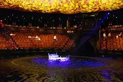 In 2008, a VIP seating area was added to the theater.[15] In 2015, an additional 172 fountains, 120 LED lighting fixtures, and 16 fire-shooting devices were added by WET Design.[4] Current capacity is 1,600 per show, excluding an underwater SCUBA viewing area that is occasionally available for VIP guests.[16]
