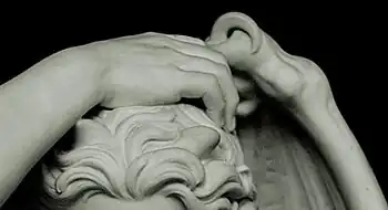 Guillaume Geefs' addition of fetters, with the swagged chain replacing the sneering serpent in Joseph's version, displays the angel's defeat in pious adherence to Christian ideology. At the same time, the titanic struggle of the tortured genius to free himself from metaphorical chains was a motif of Romanticism,[34] which took hold in Belgium in the wake of the Revolution of 1830. The Belgians had just secured their own "liberation"; over the ensuing two decades, there had been a craze for public sculpture, by the Geefs brothers and others, that celebrated the leaders of independence. The magnificently human figure of the iconic rebel who failed might have been expected to elicit a complex or ambivalent response.[35] The suffering face of the génie, stripped of the angry hauteur of L'ange du mal, has been read as expressing remorse and despair; a tear slips from the left eye.[36]