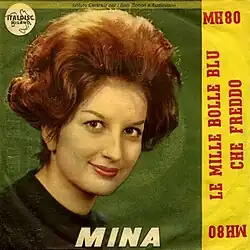 "Le mille bolle blu" ("A Thousand Blue Bubbles") is a 1961 Italian song composed by Vito Pallavicini and Carlo Alberto Rossi. Together with "Io amo, tu ami", the song was the Mina's entry at the eleventh edition of the Sanremo Music Festival, where it was presented in a double performance with Jenny Luna.[2][3] It replaced "Come sinfonia", which originally was meant to be performed by Mina together with its composer Pino Donaggio.[4] In spite of being the favorite, it only placed at the fifth place.[3] Despite its initial tepid response, it eventually became one of Mina's signature songs, and during the years has been used in films, television themes, and commercials.[3]