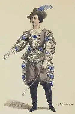 Although he was a prolific novelist and playwright, Alexandre Dumas rarely ventured into writing for the opera stage. Le roman d'Elvire was his fourth and last such work.[a] His collaborator was Adolphe de Leuven who had co-written the librettos of four earlier operas composed by Thomas, all of them in the opéra comique genre. The Théâtre Impérial de l'Opéra-Comique premiered Le roman d'Elvire on 4 February 1860 with Achille-Félix Montaubry and Mademoiselle Monrose in the lead roles of Gennaro and Elvire. The production was directed by Toussaint-Eugène-Ernest Mocker. The opera ran for 33 performances, but its mixed reviews and lukewarm reception led Thomas to abandon opera composition for the next six years. He would return in 1866 with Mignon which proved to be a great success both in France and abroad.[3][4][1][5][6]