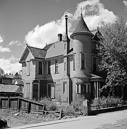 Leadville was founded in 1877 by mine owners Horace Tabor and August Meyer at the start of the Colorado Silver Boom. Tabor's house was also built in 1877, at 116 E. 5th Street.[18] The town was built on desolate flat land below the tree line. The first miners lived in a rough tented camp near the silver deposits in California Gulch.[19] Initially, the settlement was called "Slabtown", but when the residents petitioned for a post office, the name "Leadville" was chosen. By 1880, Tabor and Meyer's new town had gas lighting, water mains, 28 miles (45 km) of streets, five churches, three hospitals, six banks, and a school for 1,100 students. Many business buildings were constructed with bricks hauled in by wagons.[20]