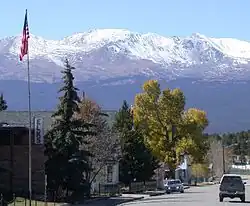 At an elevation of 10,158 feet (3,096 m), Leadville lies close to timberline, which in Colorado is from 11,000 to 12,000 feet (3,400 to 3,700 m).[42] The surrounding peaks are all well above 12,000 feet, and are thus bare of trees. Leadville has the highest elevation of any city in the United States.[43]