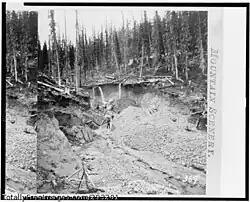 Gold was discovered in the area in late 1859, during the Pike's Peak Gold Rush. However the initial discovery, where California Gulch empties into the Arkansas River, was not rich enough to cause excitement. On April 26, 1860, Abe Lee made a rich discovery of placer gold in California Gulch, about a mile east of Leadville, and Oro City was founded at the new diggings.[3][4] By July 1860 the gold rush was on; the town and surrounding area grew to a population of 10,000 and an estimated $2 million in gold (equivalent to $70 million today) was taken out of California Gulch and nearby Iowa Gulch by the end of the first summer. But within a few years the richest part of the placers had been exhausted and the population of Oro City dwindled to only several hundred. Many claims were consolidated, and worked by ground sluicing. A ditch was dug in 1877 to provide water for hydraulic mining, but the hydraulic mining was reported to be unsuccessful.[5]