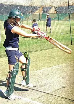 Australia stayed in England for a bilateral series against the hosts—the reigning world champions in both ODIs and T20s—after the end of the World Twenty20. Poulton scored 33 and took two catches as Australia upset England in the only T20 by 34 runs. She played in all of the five ODIs, but was not successful, being dismissed for single-digit scores every time and ending with 26 runs at 5.20.[9] She struggled to make an effective start in the matches, with a strike rate of 35.00 or less in each of her five innings and 29.54 overall.[27] England won all the matches except the last, which was ended by persistent rain. Poulton made her Test debut against England in a one-off match at New Road in Worcester. Australia batted first and Poulton came in at No. 6. She lasted only 14 balls before being bowled by paceman Katherine Brunt for 1. This was part of a batting collapse that left the tourists at 5/28, but they recovered to reach 309. Poulton then bowled four overs in the first innings, taking 0/15. She took her first catch in Tests, removing Claire Taylor from the bowling of Lauren Ebsary. Australia took a 41-run lead and Poulton then scored 23 from 41 balls before being run out as the match ended in a draw.[9][36] Poulton is the 158th woman to play Test cricket for Australia.[29]