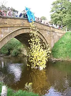 The biggest event of the afternoon is the Grand Duck Race on the River Esk,[38] where 1,000 numbered plastic ducks are launched along the river towards a finishing point some 250 yards (230 m) downstream. The six fastest ducks are then picked out at the finishing line to win cash prizes. The ducks are launched from the top of the village bridge.[39]