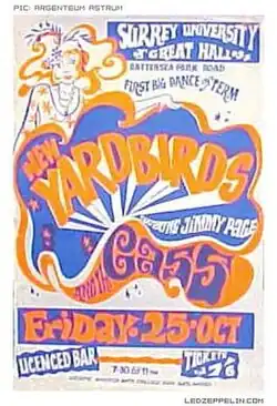 ![]() Poster for Led Zeppelin's concert at the University of Surrey (billed as "The New Yardbirds featuring Jimmy Page"), used to help promote its 1968 U.K. tour | |