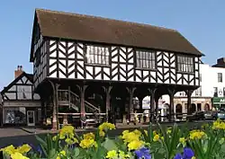 It has a significant number of Tudor-style timber-framed structures, in particular along Church Lane and High Street. One of the most outstanding is Ledbury Market Hall,[2] built in 1617, located in the town centre. Other notable buildings include the parish church of St. Michael and All Angels,[3] the Painted Room[4] (containing sixteenth-century frescoes), the Old Grammar School, the Barrett-Browning memorial clock tower[5] (designed by Brightwen Binyon and opened in 1896 to house the library until 2015), nearby Eastnor Castle and the St. Katherine's Hospital site.[6] Founded c. 1231, this is a rare surviving example of a hospital complex, with hall, chapel, a Master's House (fully restored and opened in March 2015 to house the Library),[7] almshouses and a timber-framed barn.
