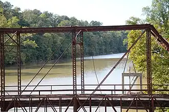 The Lee Creek Bridge is a historic bridge across Lee Creek in Van Buren, Arkansas. Now closed to traffic, it is a three-span truss bridge located west of Rena Road on the city's west side. The bridge's single Pratt through truss was built in 1898, and a pair of Warren pony trusses were erected in 1930 to replace a second Pratt truss. The trusses rest on original stone piers. The bridge has a total length of 296 feet (90 m), of which 126 feet (38 m) is the Pratt truss. The bridge was bypassed and closed in 1995.[2]