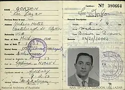 His "Alien Certificate" (see image below), issued to him by the Australian Department of Immigration shortly after his arrival there in 1953, records his birth as 8 March 1923 in Michigan, although other sources claim that Gordon was born in 1917 in Coral Gables, Florida. His Certificate also, notably, has no entry in the line for "Previous name (if any)", which is at odds with the generally accepted account that he had changed his name from "Gevorshner" to "Gordon" some time before his arrival in Australia. It also indicates that he travelled from the U.S. by ship (vessel registration N1025V), disembarking in Sydney, and the attached identifying photograph provides a rare image of Gordon before he underwent plastic surgery to change the shape of his nose.