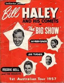 In March 1957, Gordon presented his first major rock'n'roll tour, an all-star bill with Bill Haley & The Comets, LaVern Baker, Big Joe Turner, The Platters and Freddie Bell and the Bellboys. Although local pundits were already predicting that rock'n'roll was a passing fad, the tour was a huge success, breaking box office records around the country, and over 300,000 people saw the show.[43] During the tour Johnny O'Keefe met Haley several times and was given a number of songs by Haley—although with his typical chutzpah, O'Keefe greatly exaggerated the extent of the contact when talking to the press.[44]